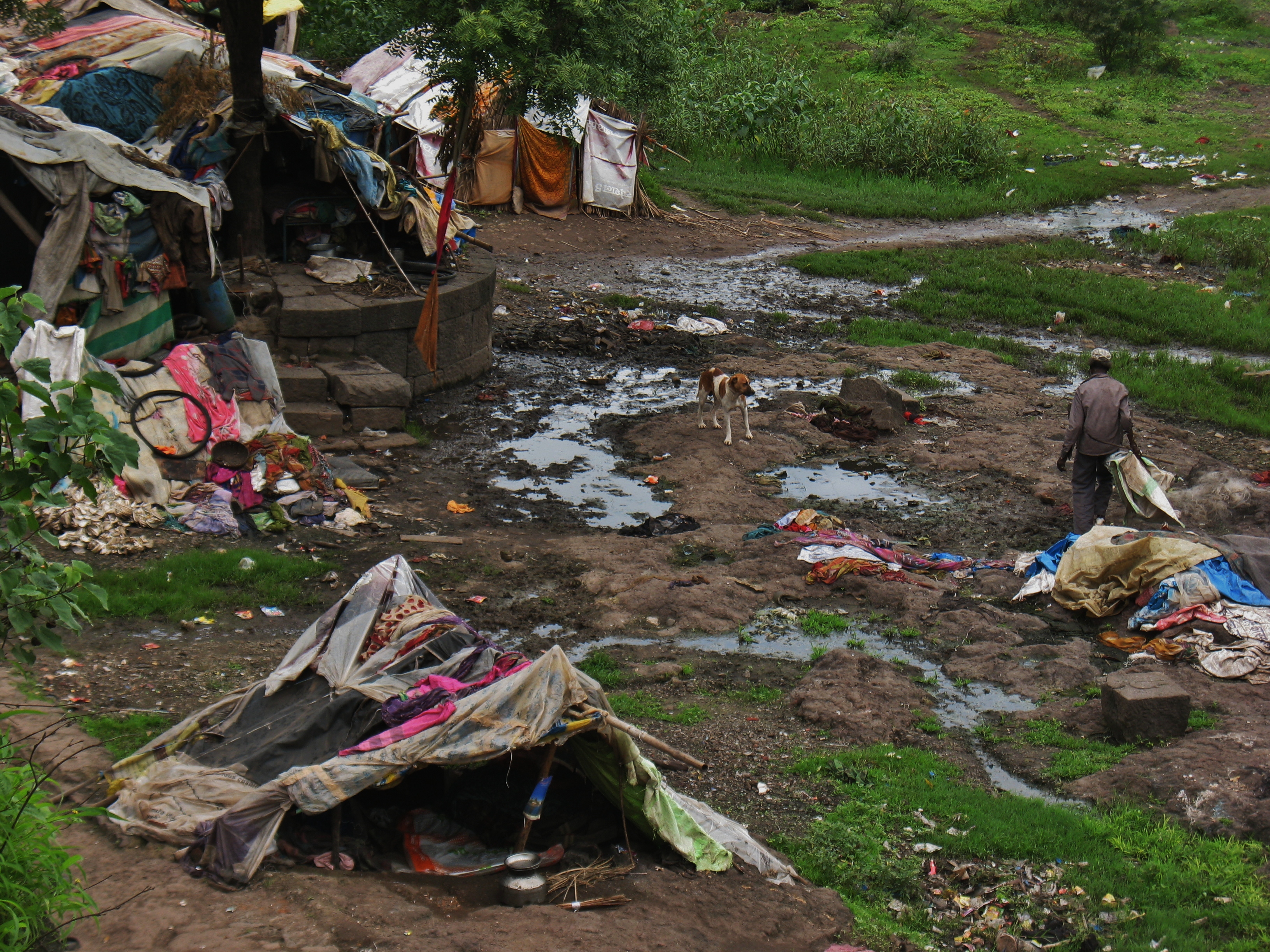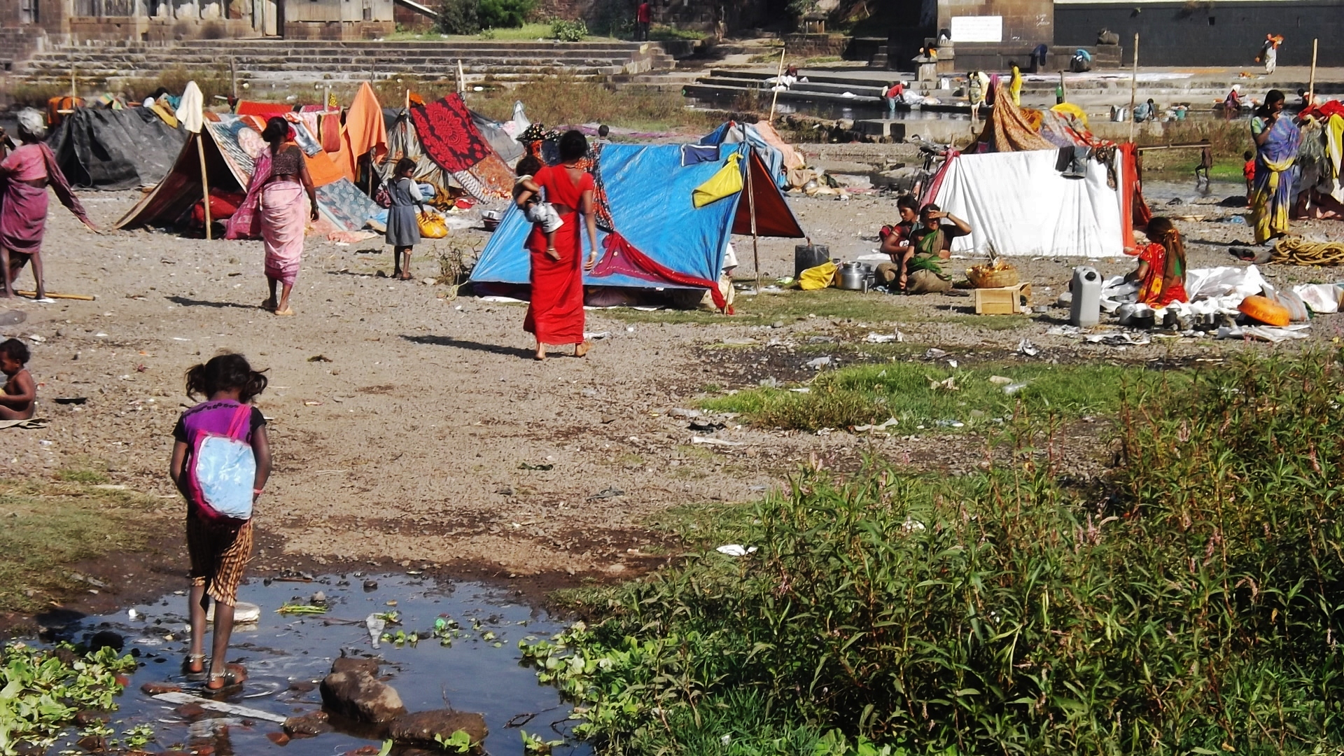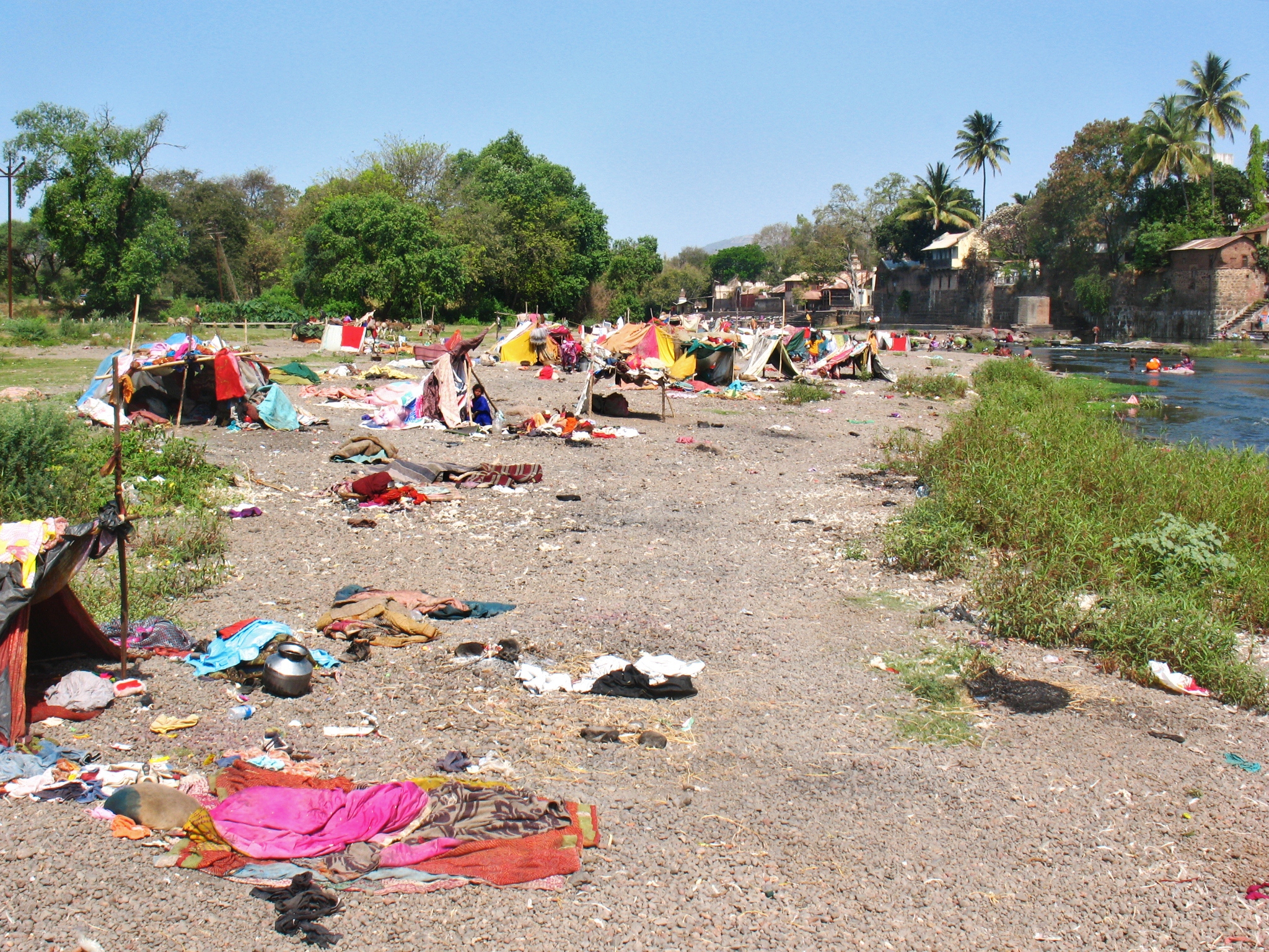 On the city of Wai, a large community lives by the river due to not having any other place to stay. Most of the land in the surroundings of the city are private owned by small farmers or bought by Mumbai business men for development projects. Besides the fragility of their homes, mainly tents made of reclaimed canvas from advertisement banners, they face floods from the river in every monsoon season. The sewage of the whole city comes directly to the riverside where they live in order to be flushed by the river, making them a population prone to diseases and extreme lack of hygiene and sanitation. They have no other place for fishing so they eat the fish they catch on the river, as well as taking bath and washing their clothes and dishes on its waters.