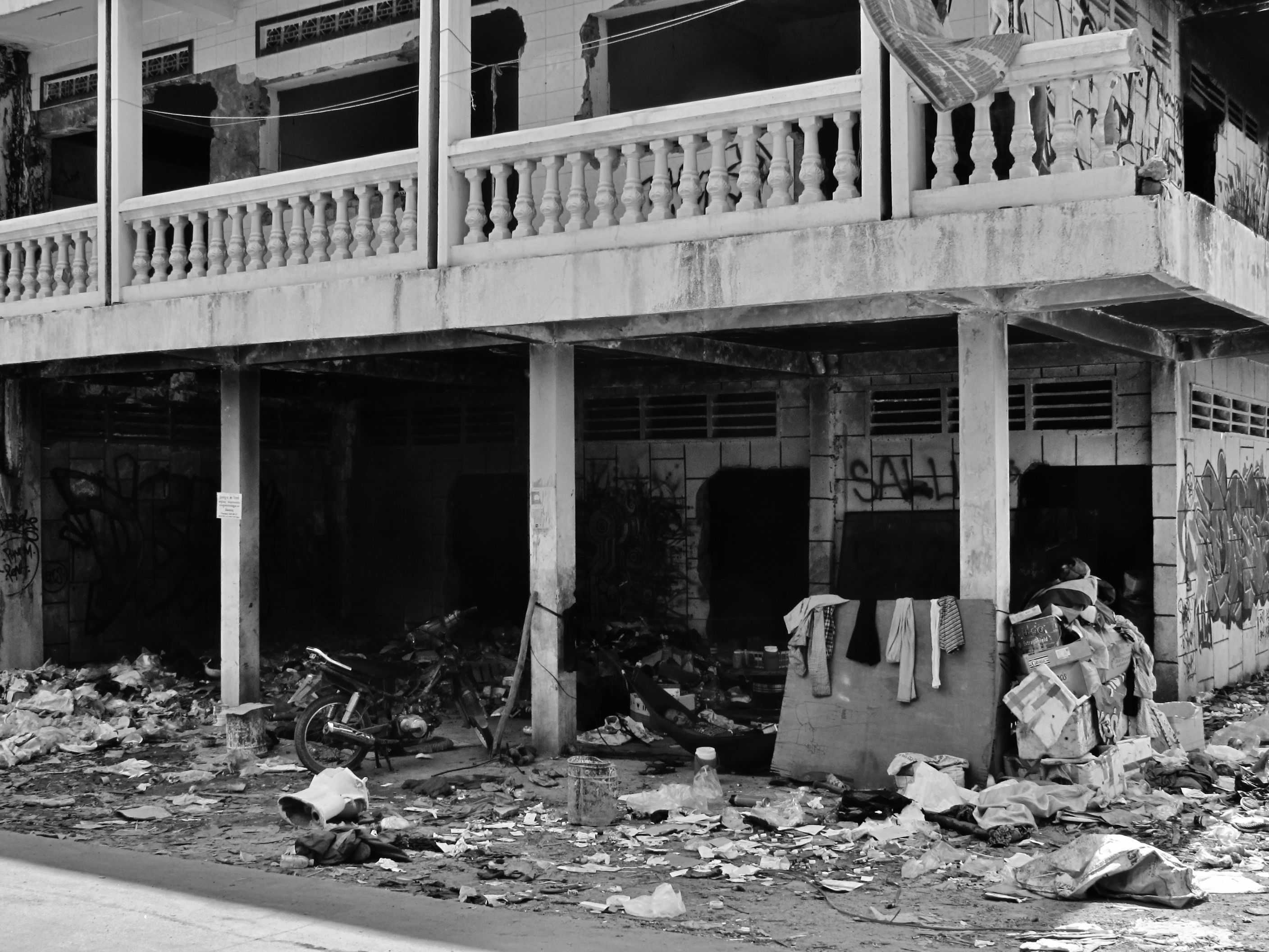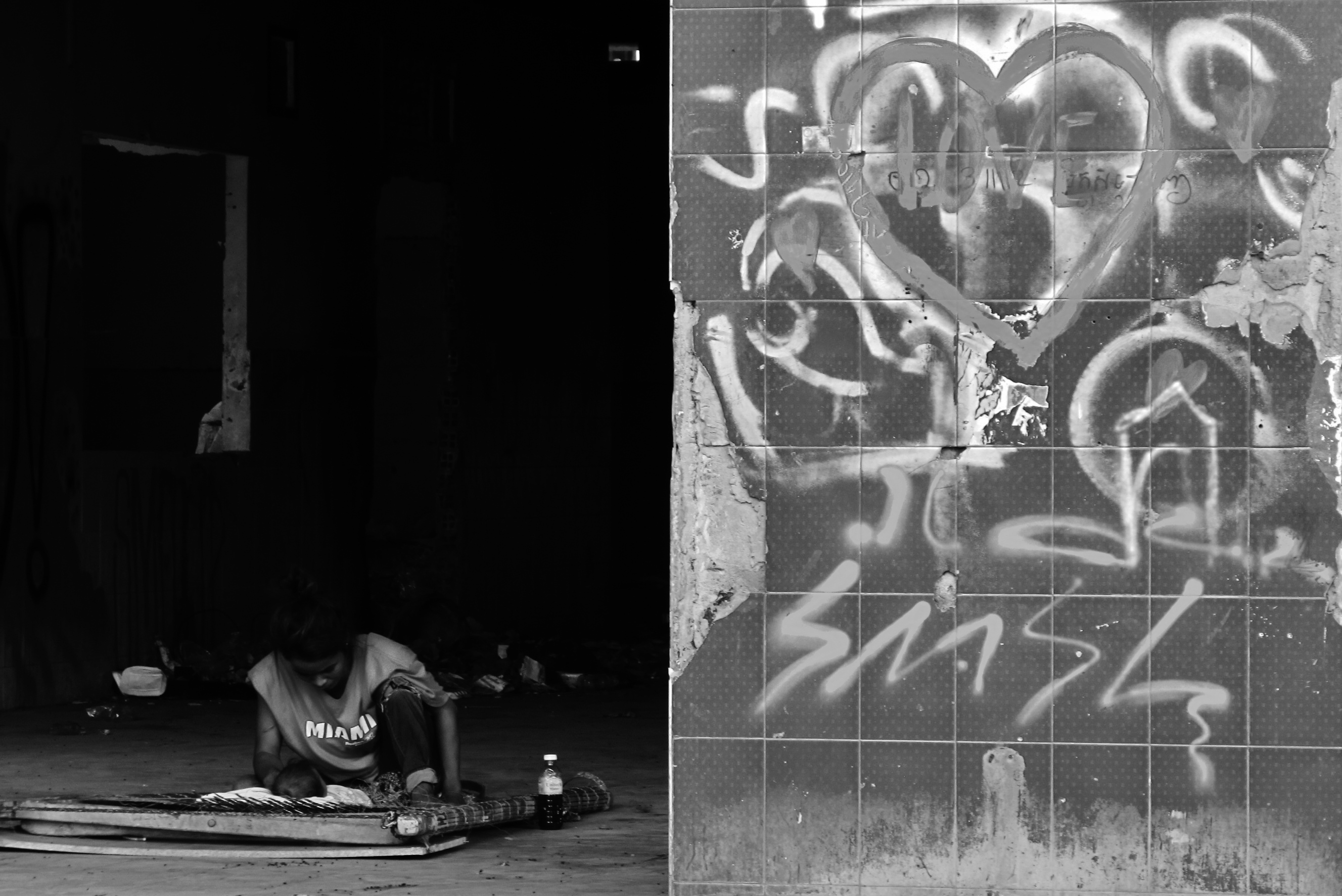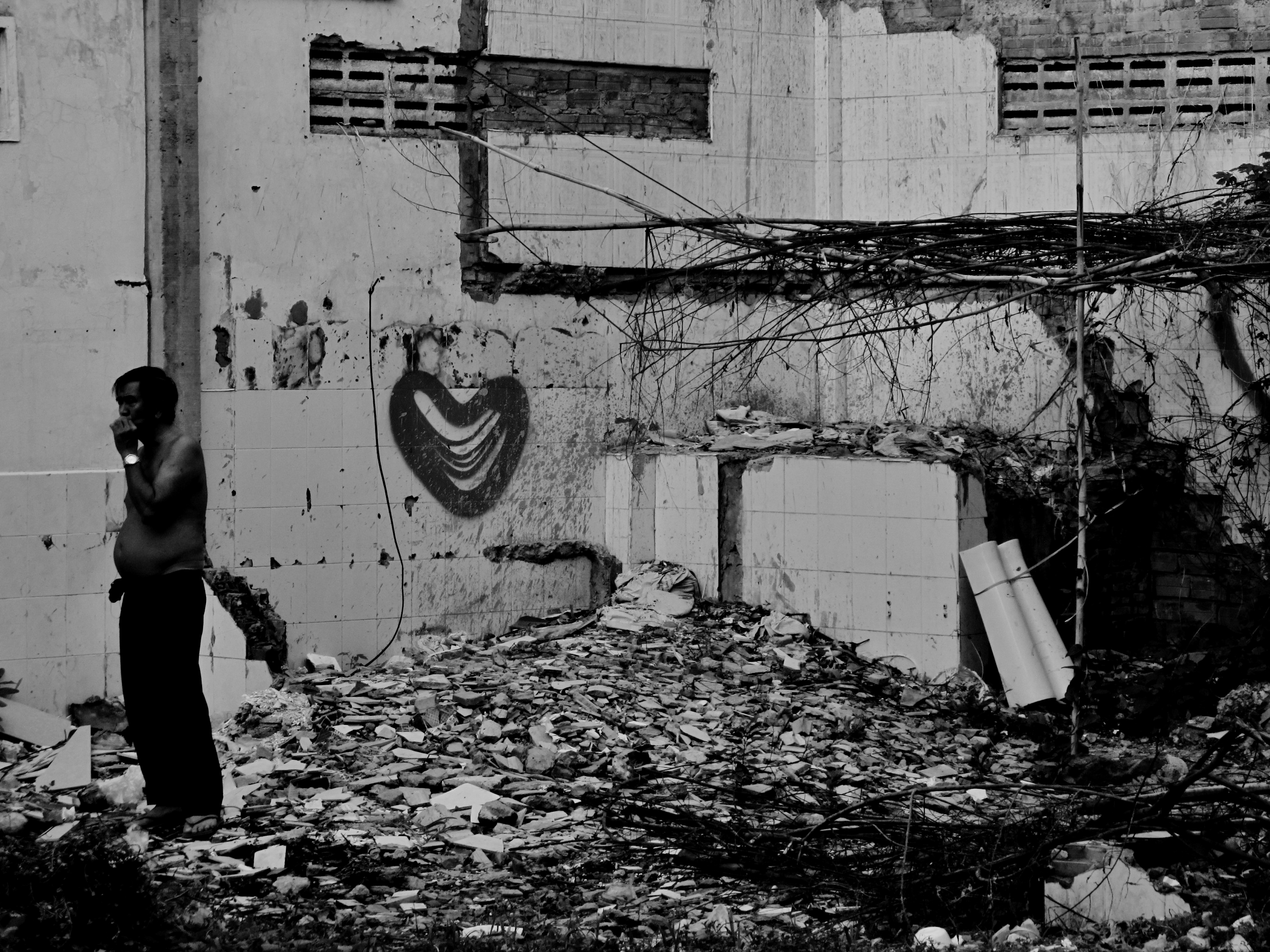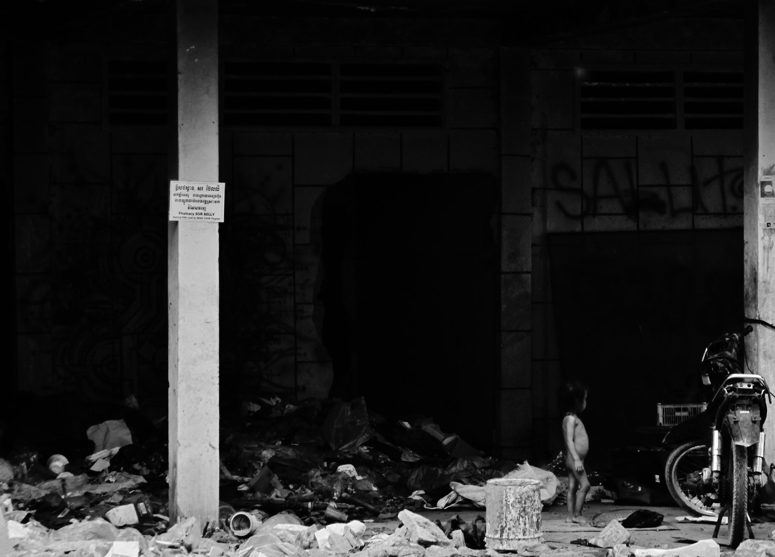 Boeung Kak is a strange place. Located in the center of the cambodian capital of Phnom Penh, it had the unique feature (for a city) of being a neighbourhood built around a beautiful lake. Crowds of young backpacker tourists were used to populate its margins, helping a vibrant local economy and its low-income population. Relaxed environment and sunsets on the lake were the common experience here, until the municipality sold it to a company owned by the wife of a ruling party’s senator. Since 2008 the lake had been filled with sand and is now a construction site for high-end buildings, somehow in standby, while around 4000 families (almost 20.000 people) were forcibly evicted from their homes. Nowadays, most of the tourism industry fled, depleting the local economy and the general mood of the community. Nevertheless, some travelers and expats still come and try to maintain the creative atmosphere that was going on in the old days, with street art still populating many walls. Meanwhile some buildings got vacant, with time and lack of maintenance turning them into shady and forsaken sites. That’s when some underpriviliged families started to live in them. This a glimpse of them and their way of living, in black-and-white as an attempt to balance the color on the walls and the lack of it on the ones living inside them.