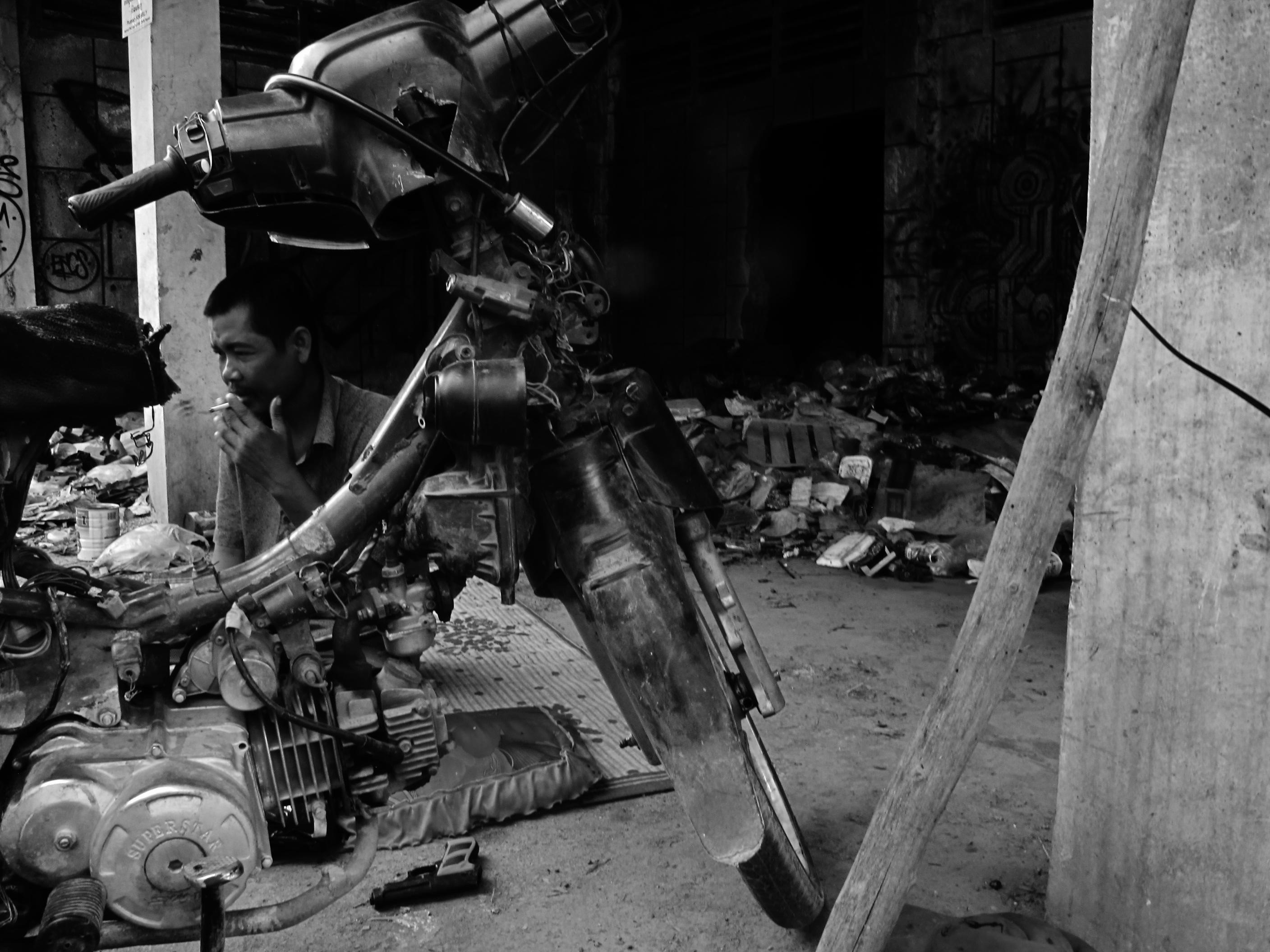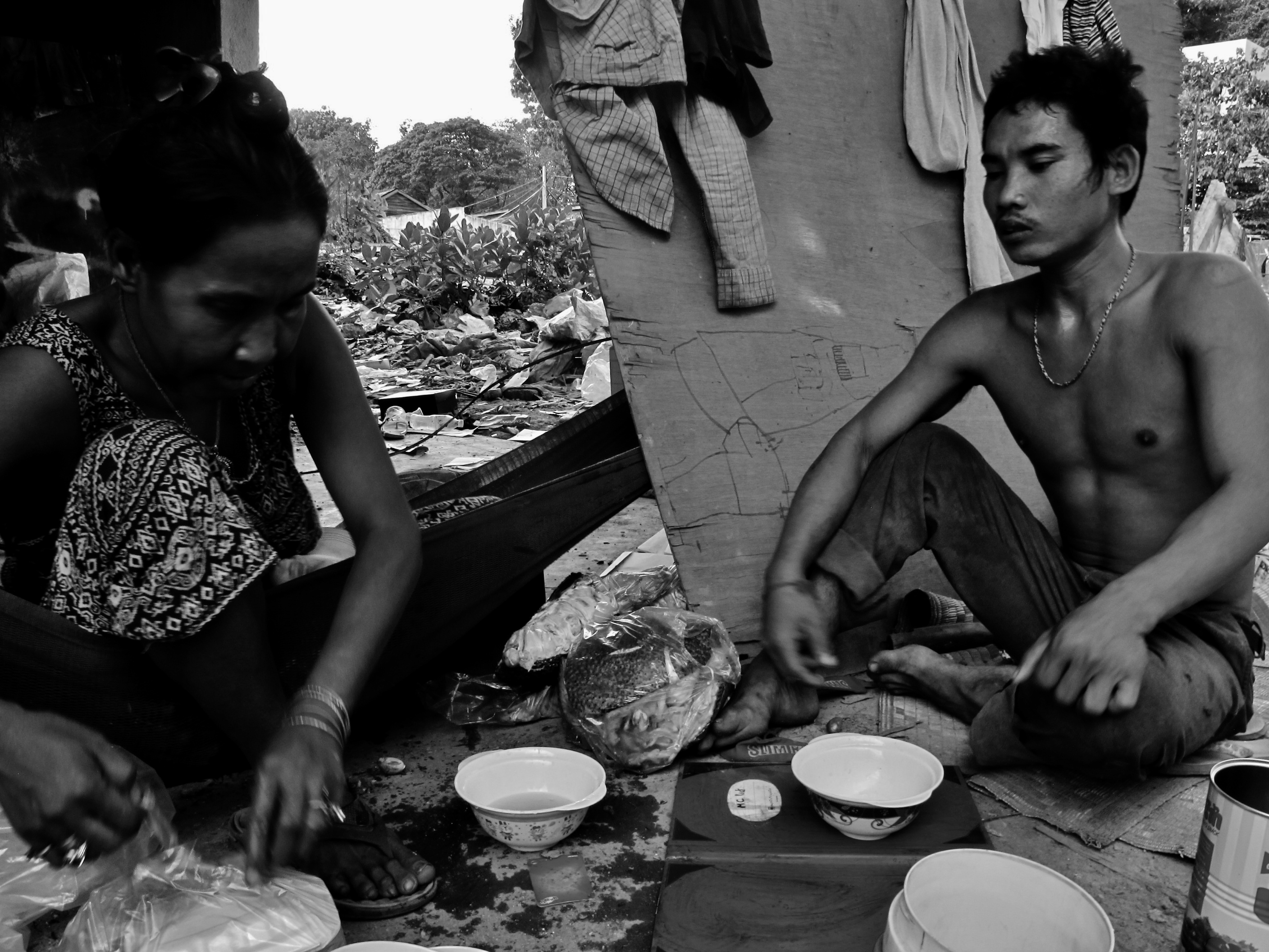 Sometimes the contrast can be too surreal, too difficult to deal. When I saw happy faces with noodle bowls while one family was eating a rotten jackfruit directly from the garbage, I crossed the blurry line between the pure observing and participatory attitudes towards the subject one is photographing. I bought them some rice and vegetable soup, and sit with them to talk while they were enjoying their unexpected meal. What’s ethics in documentary photography is that kind of old debate with no straight answers, a tricky balance to manage. What are the limits of impartiality? Is it acceptable to take photographs while giving nothing back? What about its opposite, do we risk to spoil the authenticity of a picture if we actively engage in its scene?