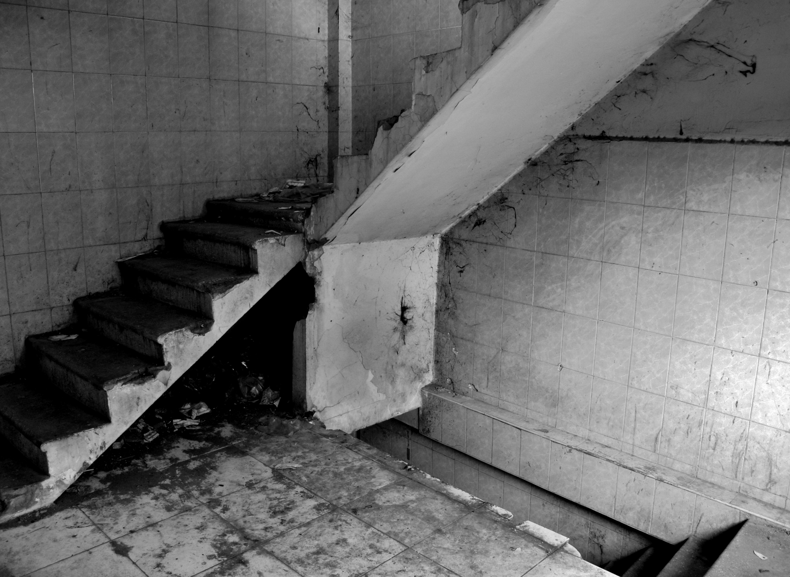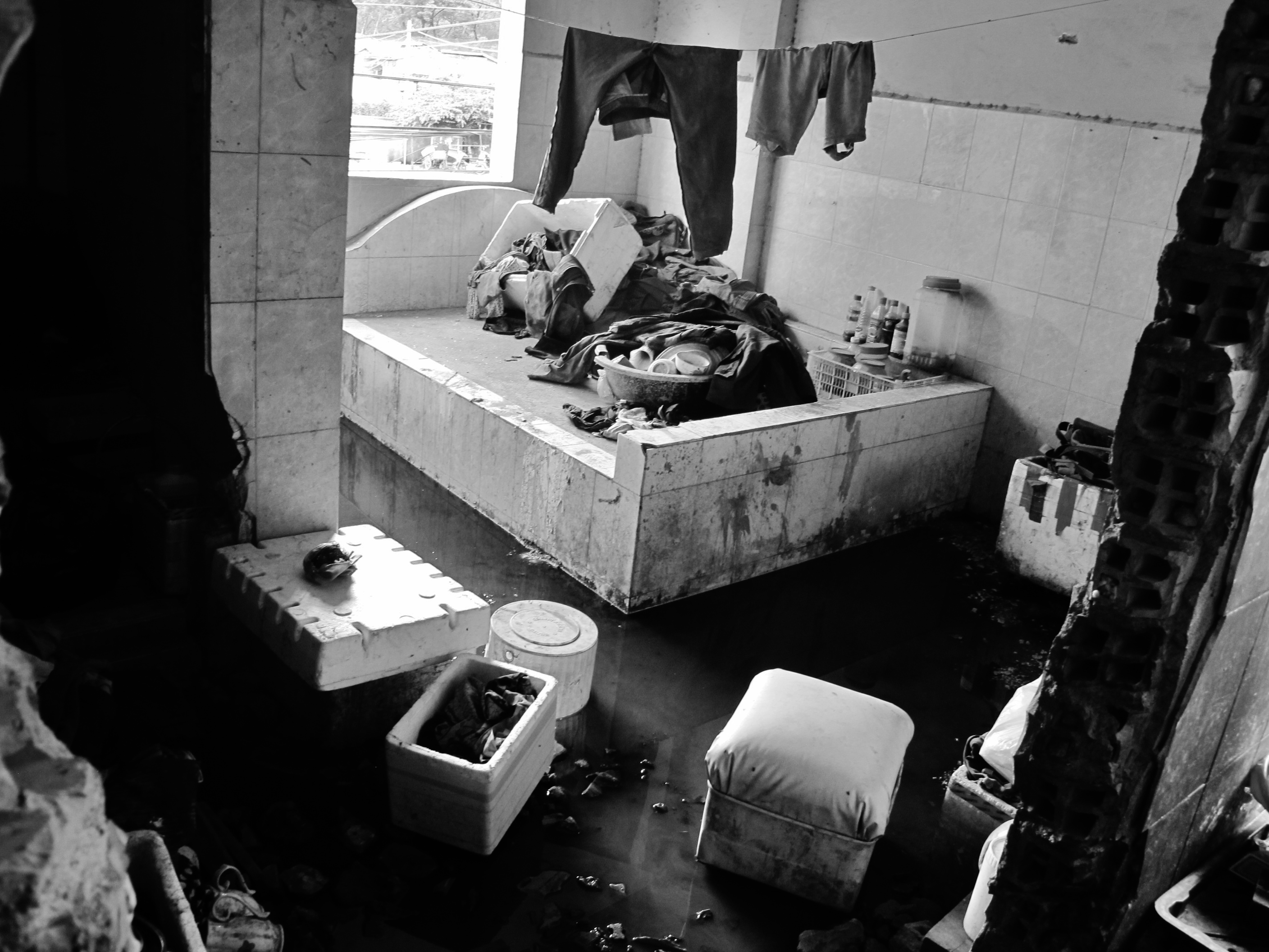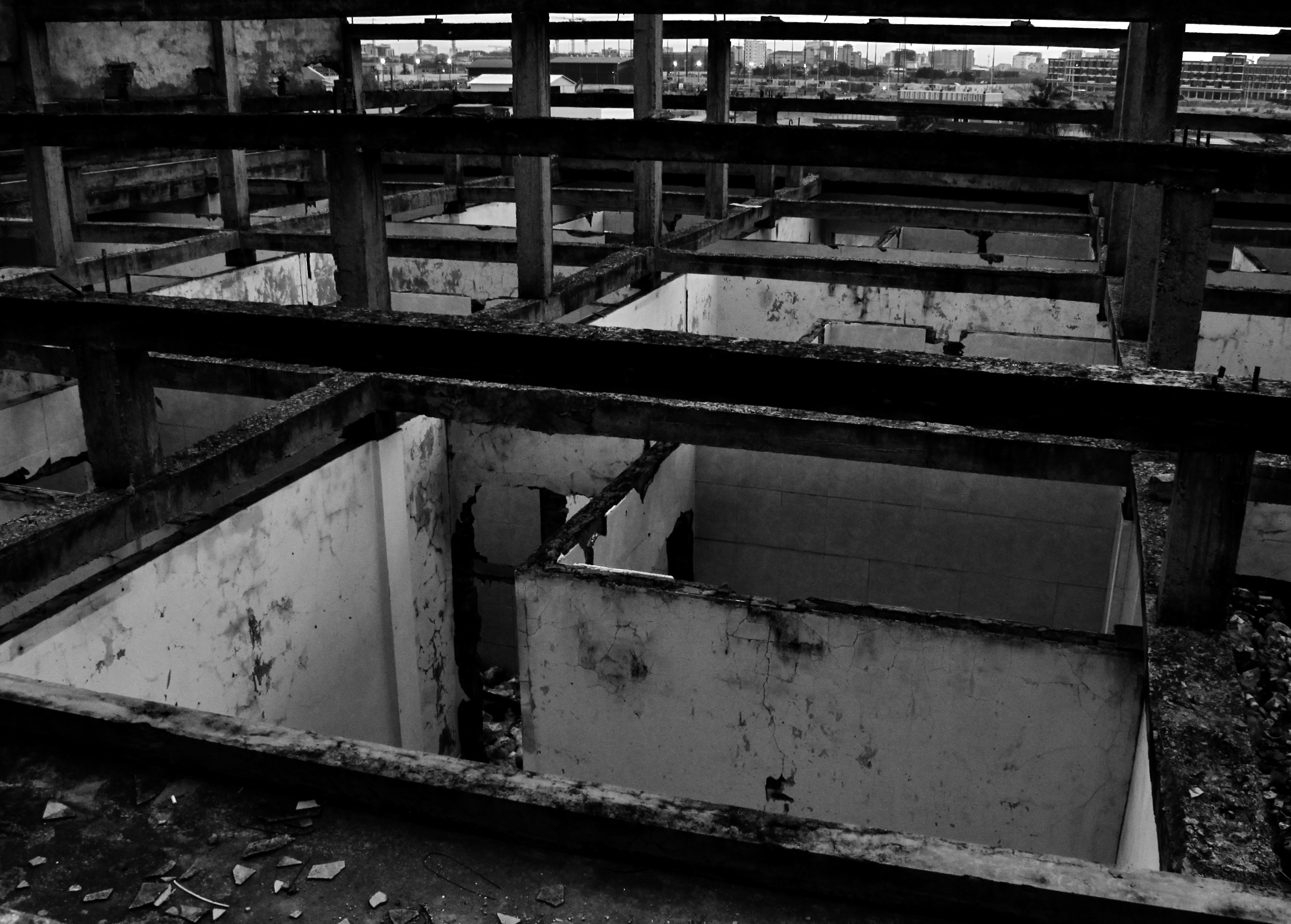 Trash and flooded floors due to the rainy season compose the environment inside, while on top of the building is possible to see the skeleton of what one day this complex was.