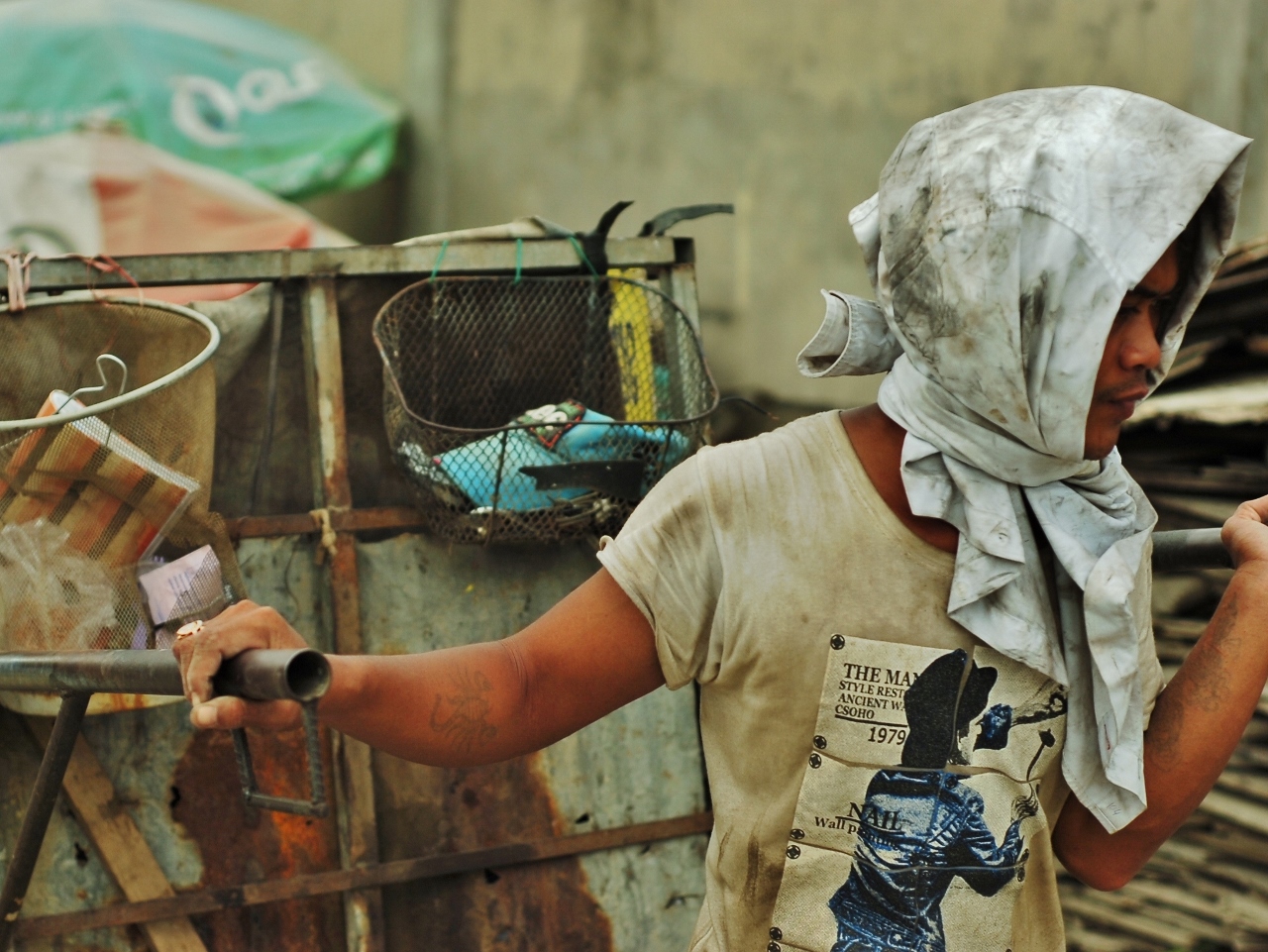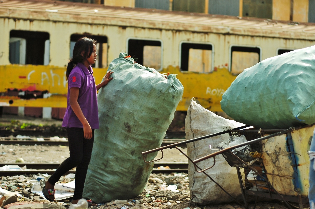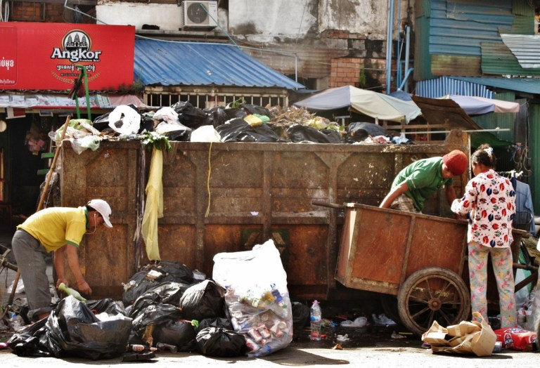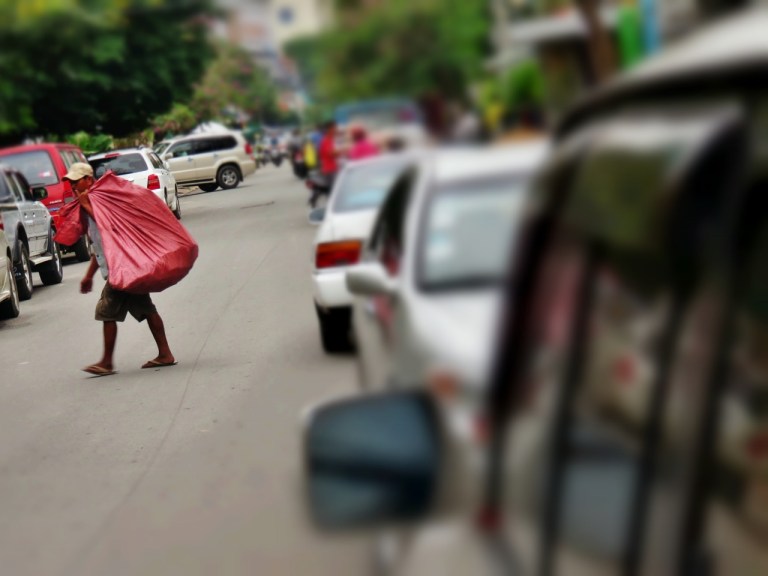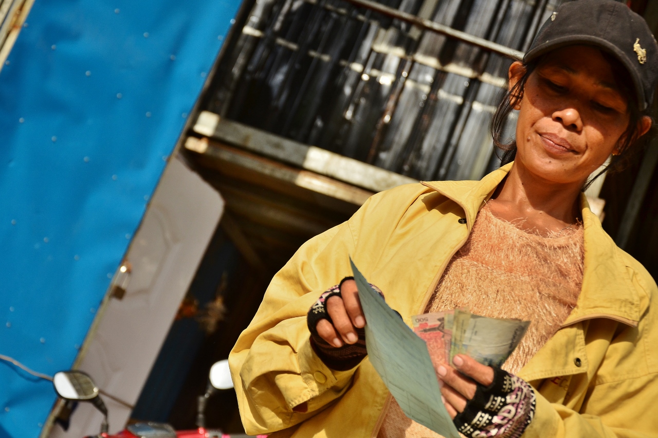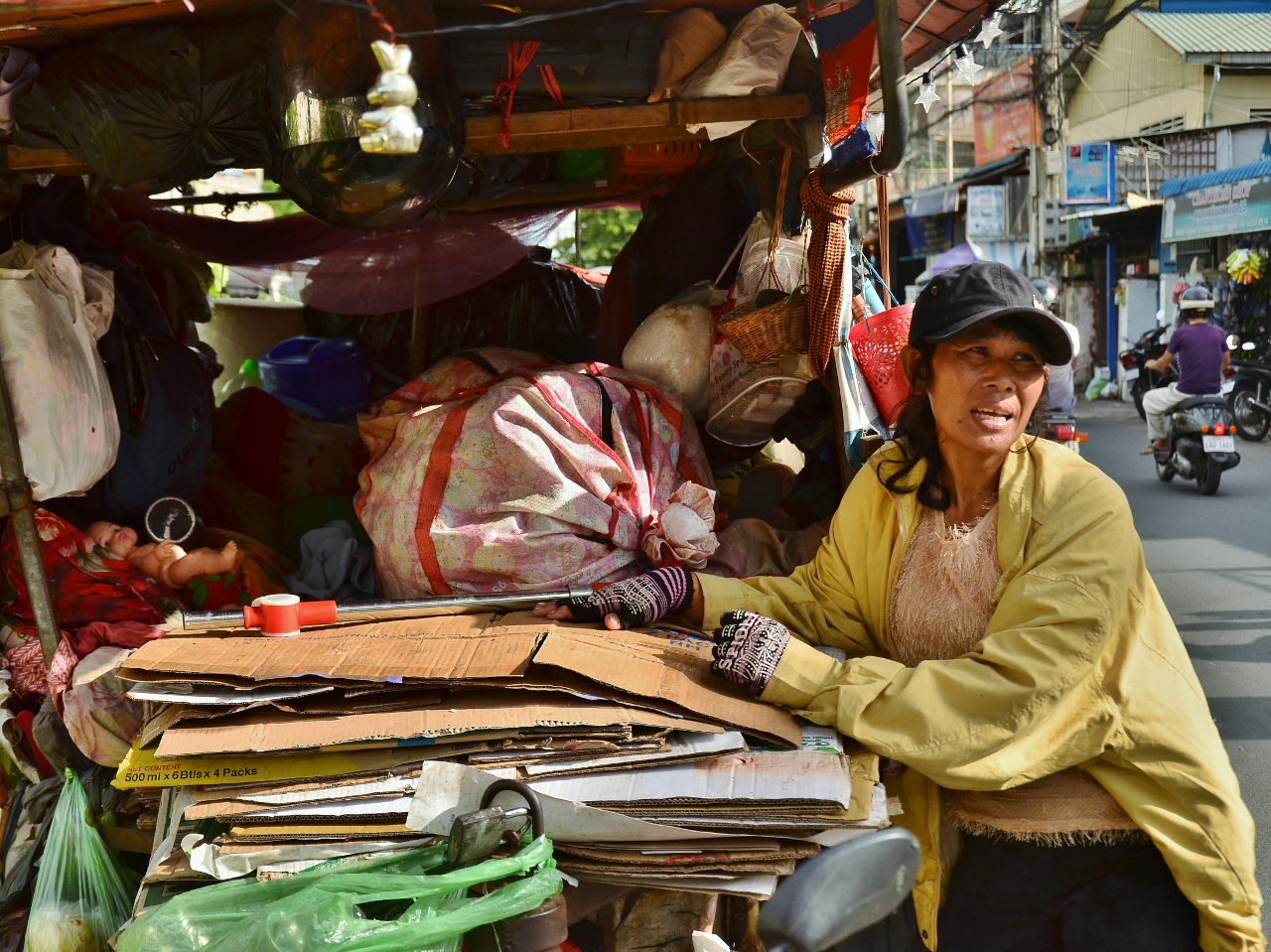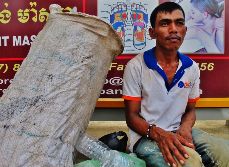 Kong Vanny, a single mother with three children living on the street, receiving the payment of her today’s collection. Street edjais can make from $2.5 to $7.5 a day depending on luck, weather or their health condition. If one day an edjai can’t work, there is no support system to help her making ends meet. But in the end, they are the ones making it possible to recycle some of the trash produced – an estimation of 11% of the total waste.