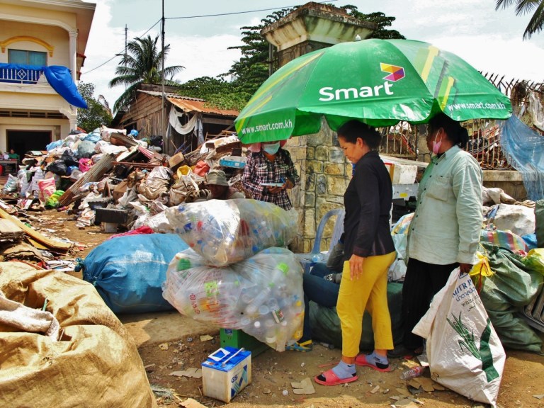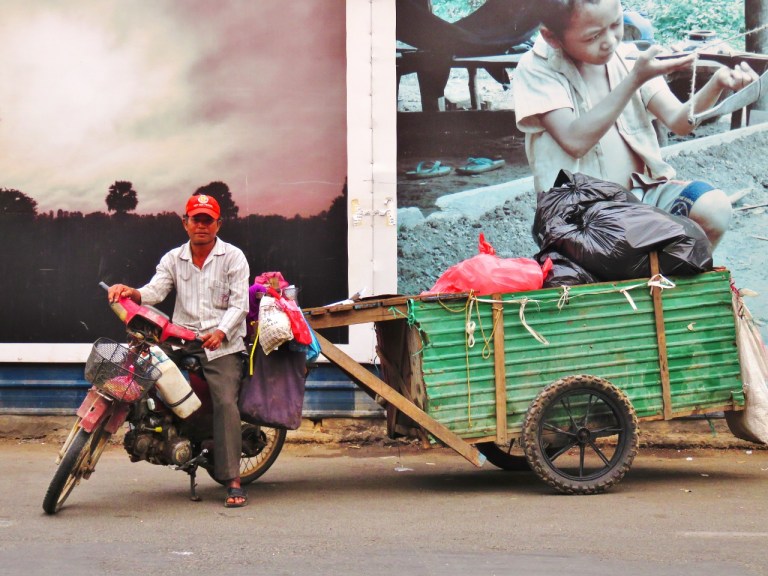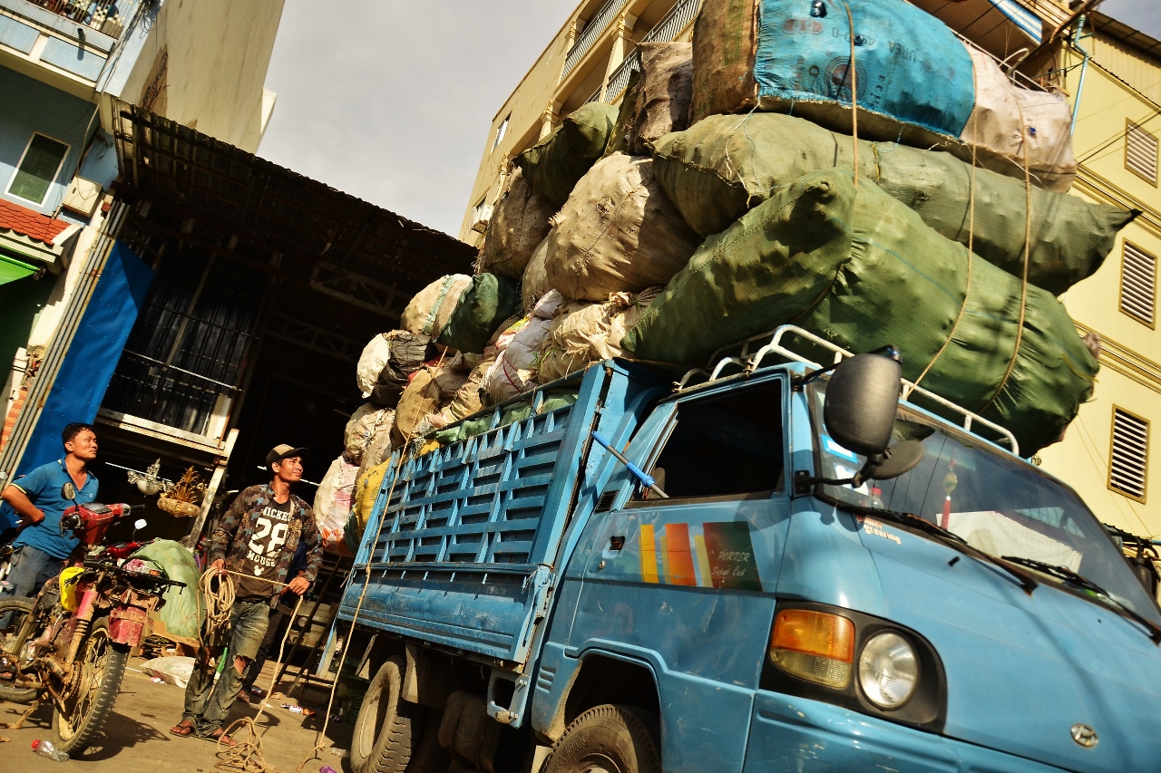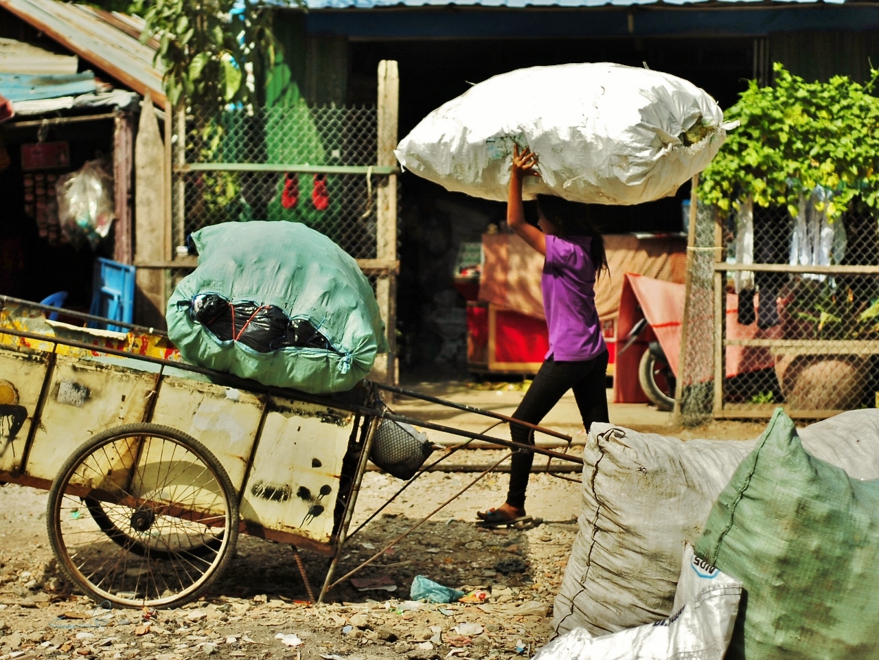 With the lack of formal structures to deal with the country’s waste, Cambodia leaves its rising problem to edjais, a local term for the informal waste-pickers that wander the streets with handcarts looking for something valuable to sell. It’s estimated that 3000 tonnes of waste are produced per day just in the capital Phnom Penh (600 of them being plastic), so there is plenty to be selected, hand-picked and sold for further processing downstream in the recycling trail.