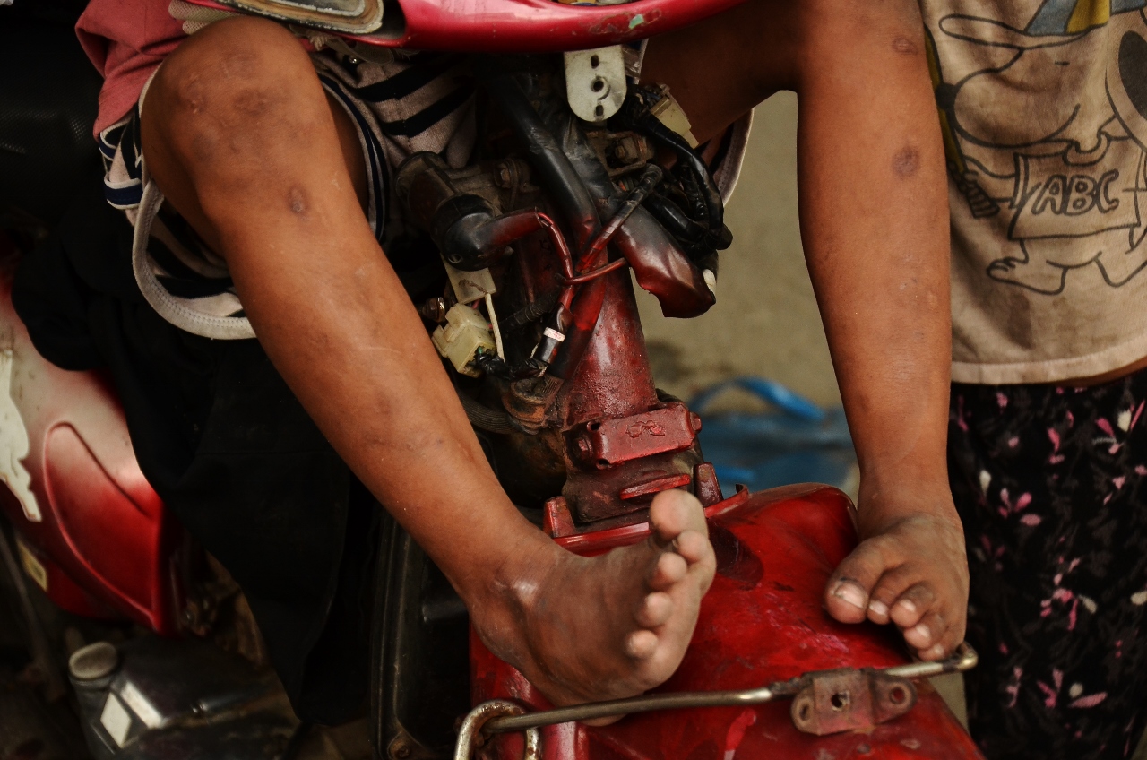 Kid playing in a metal collection center. The whole system is based in an informal hierarchy that goes from the street edjais to small collection centers where they sell the trash of the day, and from these ones to larger centers where it will be compressed for export in bulk quantities. A process that can reach five to seven middlemen from the moment a piece of garbage is hand-picked to the moment it arrives to an actual recycling factory. In the case of this picture, the center focuses on buying metal, with cans of beer or soft drinks being the items which give street edjais the highest value, with prices sometimes reaching up to 2500 riels/kg ($0.60).