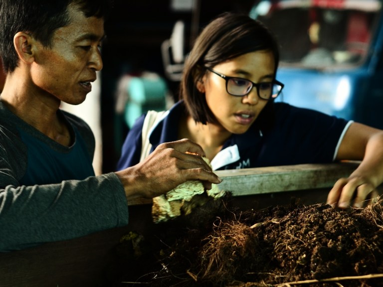 Monorom Tchaw, a local activist for composting, checking the Twin Agritech’s vermi-compost process which uses worms to accelerate the decomposition of biodegradable materials, which will be, in the end, sold to a large agriculture client as organic fertilizer. Csaro is a local non-profit which is also dealing with compost, processing 4 tonnes/day of wet waste from Phsar Damko, a popular street market, and selling it to smallholder farmers for 50cents/kg.