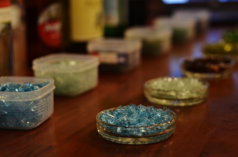 Samples of glass gravel from different types of bottles. In Siem Reap, a cooperation between the social enterprise Naga Earth and Gaea, the municipal waste management company of Siem Reap, is piloting the first project on glass recycling in the country – a material not usually picked up by edjai due to lack of market value. Planned to be launch later this year, they already started to collect bottles in order to pulverize it into sand and gravel for use in the production of concrete, asphalt, artisinal glassware, water filtration, decoration or jewelry. Their glass pulverizer can process five tonnes per day and reduce its volume up to 80%.
