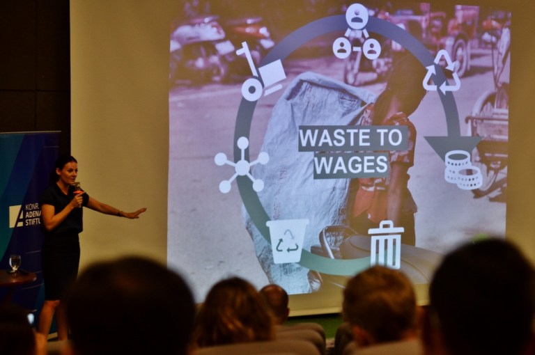 Grace Smith, an international expert on waste from the Go Green Cambodia project, presenting in the Waste Summit 2019 their proposed project to formalize the jobs of edjais in a structure supported by government, waste collecting companies such as Cintri, municipalities and other stakeholders. With an estimated kick-start for next year, this is a program which a potential to provide increased working conditions to the waste-pickers, such as higher hygiene and safety standards, stable income and better tools, while coordinating the different stakeholders to upgrade the whole recycling industry in the country.