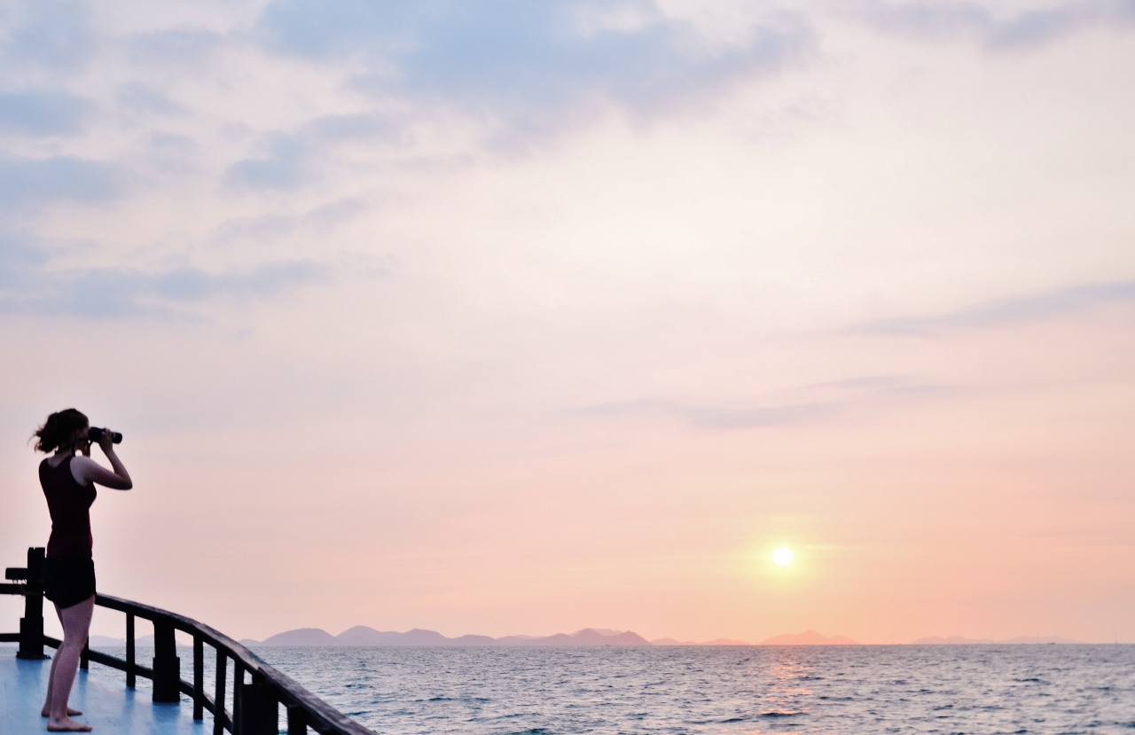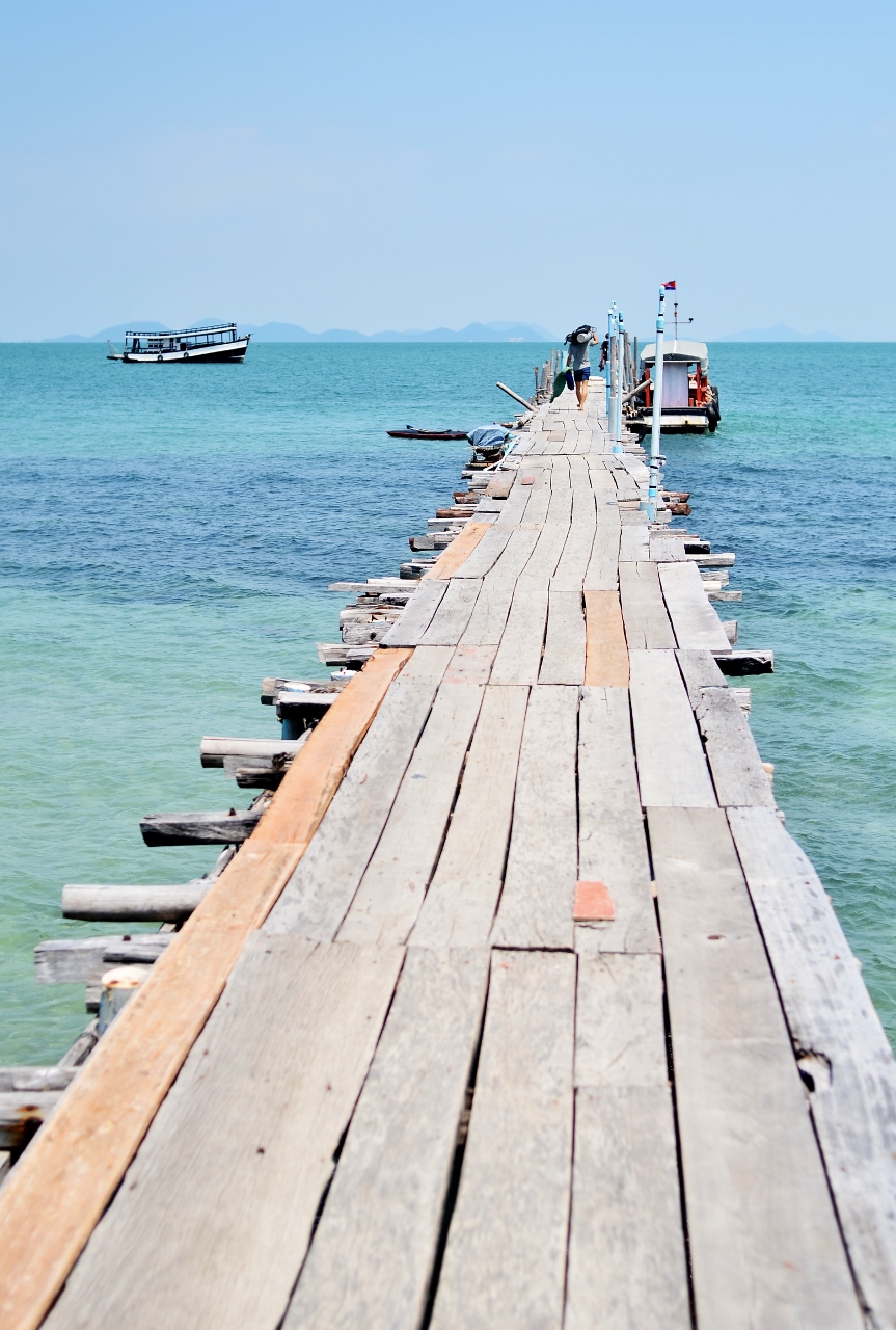 Jaime Gill from the UNICEF team walking in the Koh Ach Seh pier during sunrise.