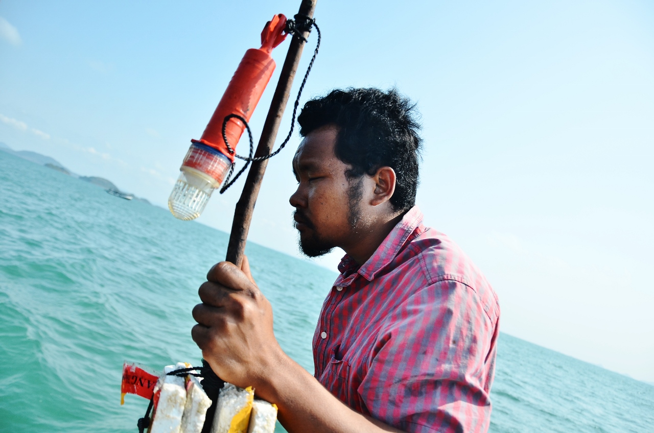 Samnang Ry, 27, holding fishing nets confiscated from illegal fishermen during a demonstration on the efficacy of MCC’s anti-trawling structures in trapping the nets and reducing unsustainable fishing practices in the area surrounding the Koh Seh island.