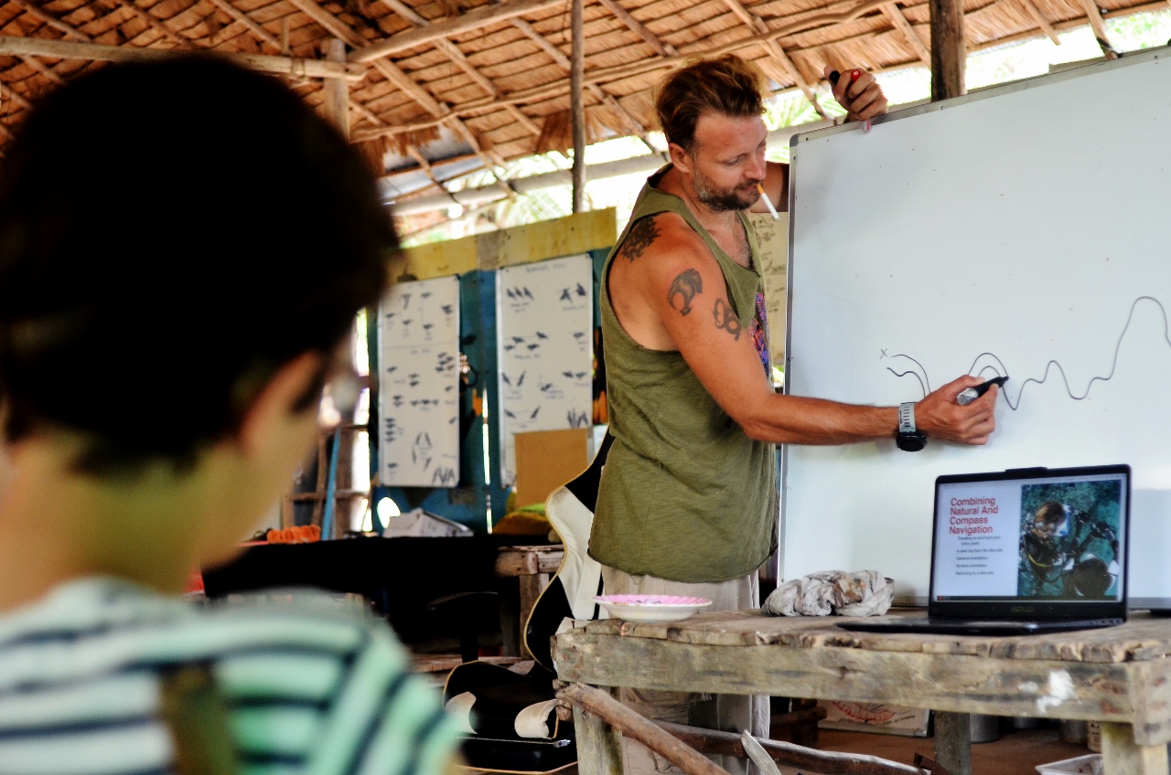 David Ideler, working on seagrass mapping on a hammock at the main beach of Koh Ach Seh.