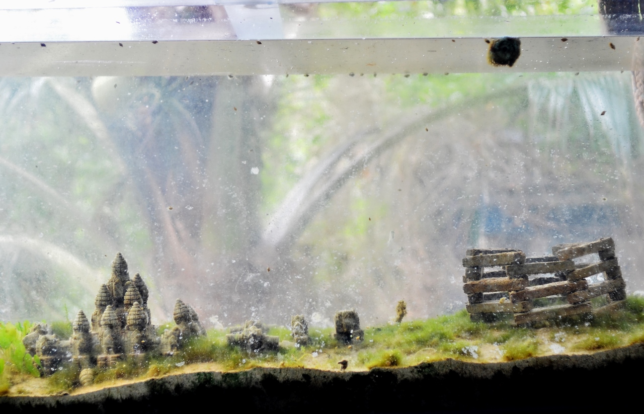 Details from an aquarium in MCC’s main building, including small models of Angkor Wat and the NGO’s anti-trawling block structures, plus some species such as a starfish.