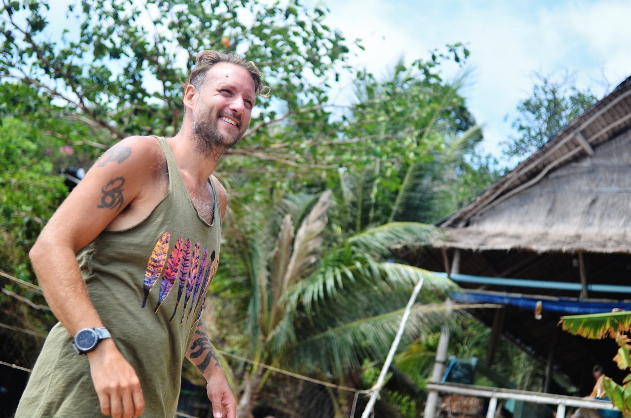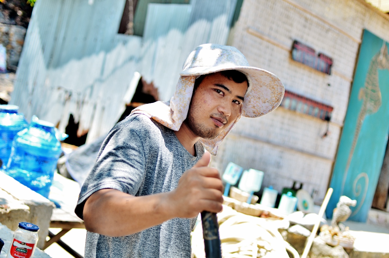 Samnang Ry, 27, holding a sea shell. Beloved by the whole team and always with a playful attitude, he often finds improvise hats out of trash collected during beach clean-ups.