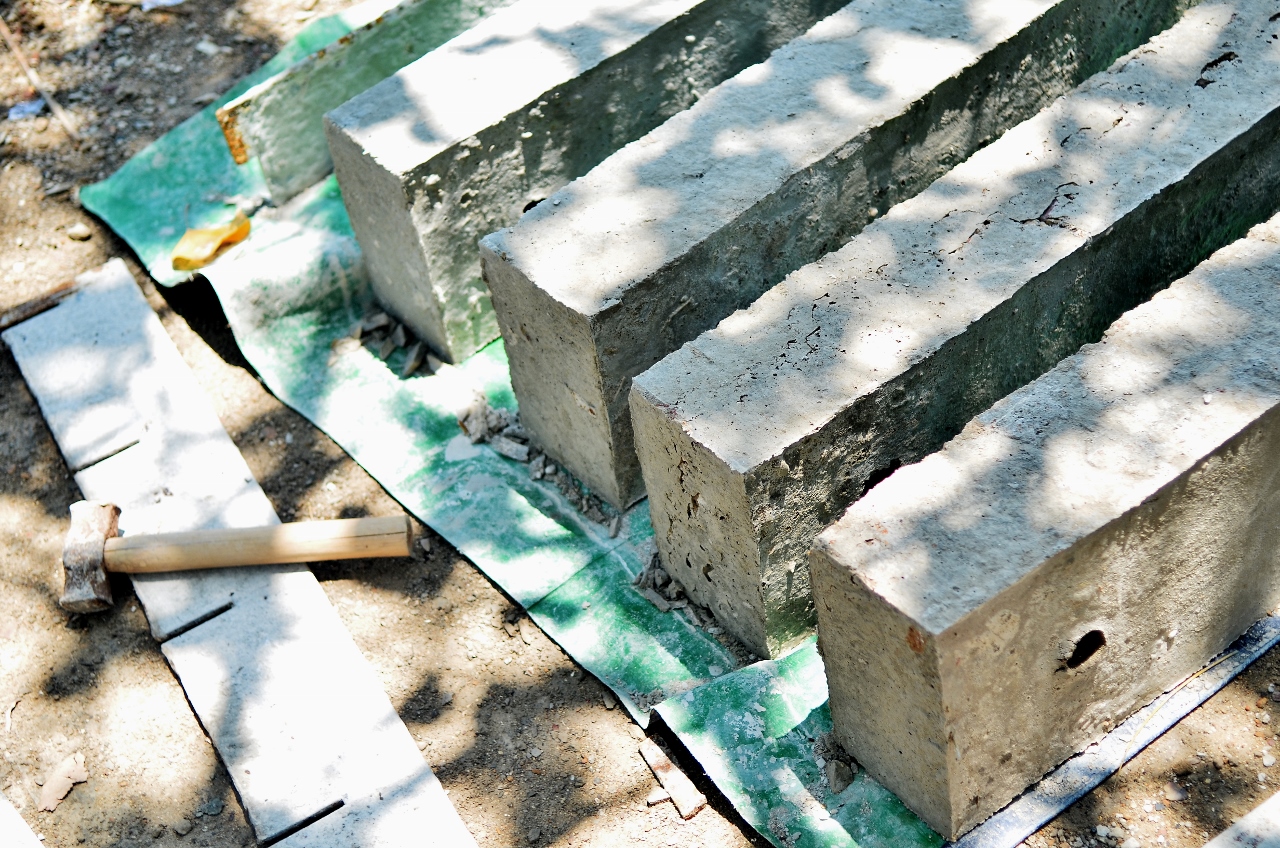 The team member Kong Vichet at work mixing cement for building anti-trawling block structures.