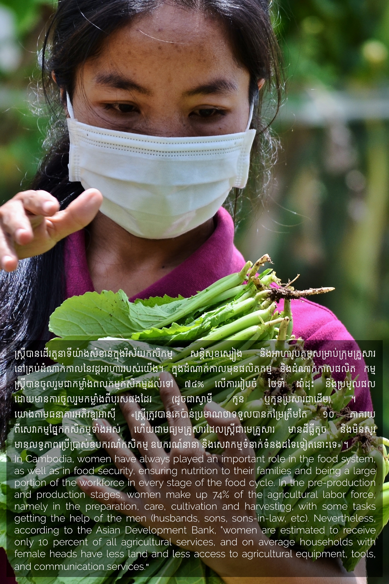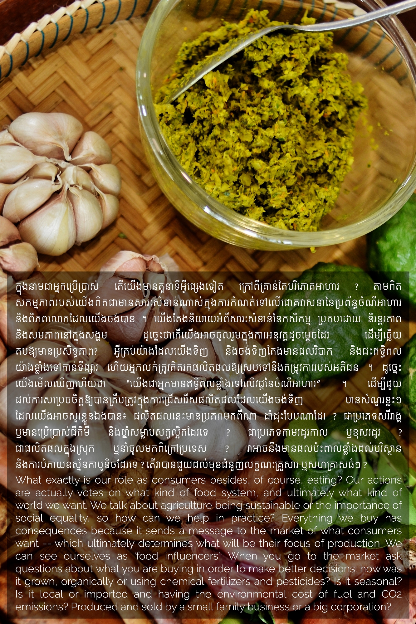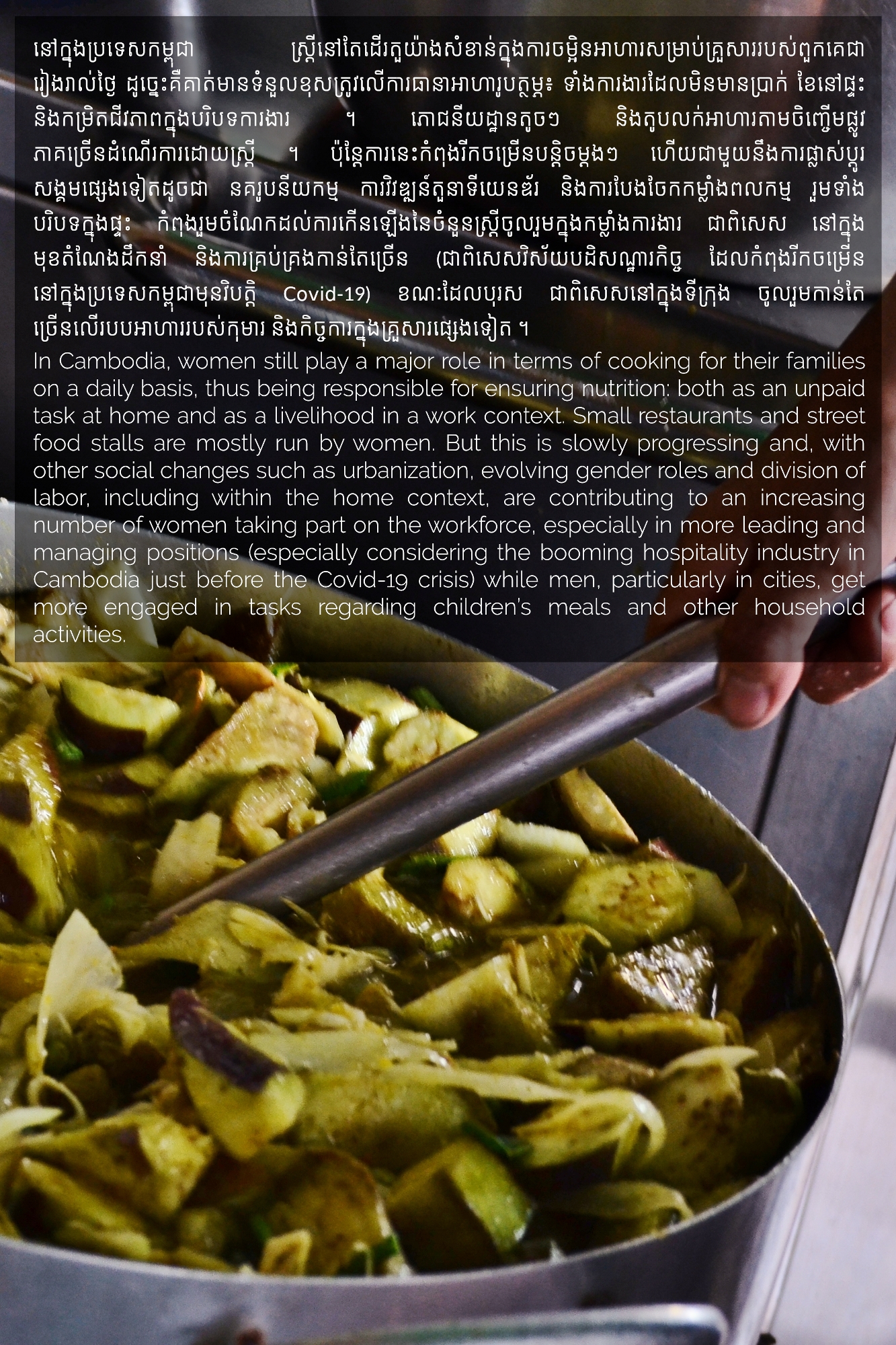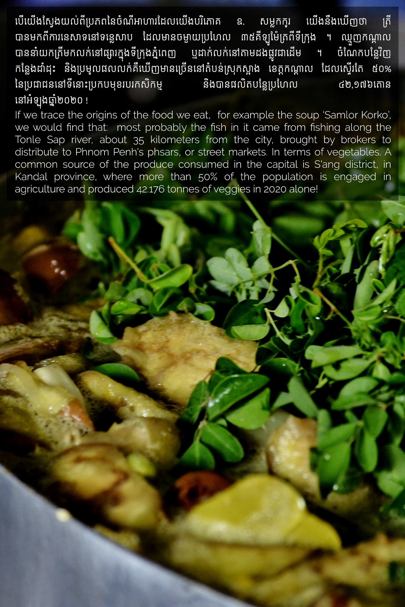 Part of MHOPe, a collaborative media project of Heinrich Böll Stiftung Cambodia on food systems in Cambodia, focusing on topics such as food security and the socio-economic aspects of nutrition, the origins of the ingredients we eat and the invisible lives of the workers along the food cycle. Using a Cambodian traditional dish (Samlor Korko) as a starting point of discussion, we follow each step from pre-production to waste management, addressing the themes of gender and sustainability. We believe we are what we eat and, to give more value to what ends up on our plate, we need to be aware of what’s happening along the way. From farm-to-table and from table-to-farm.