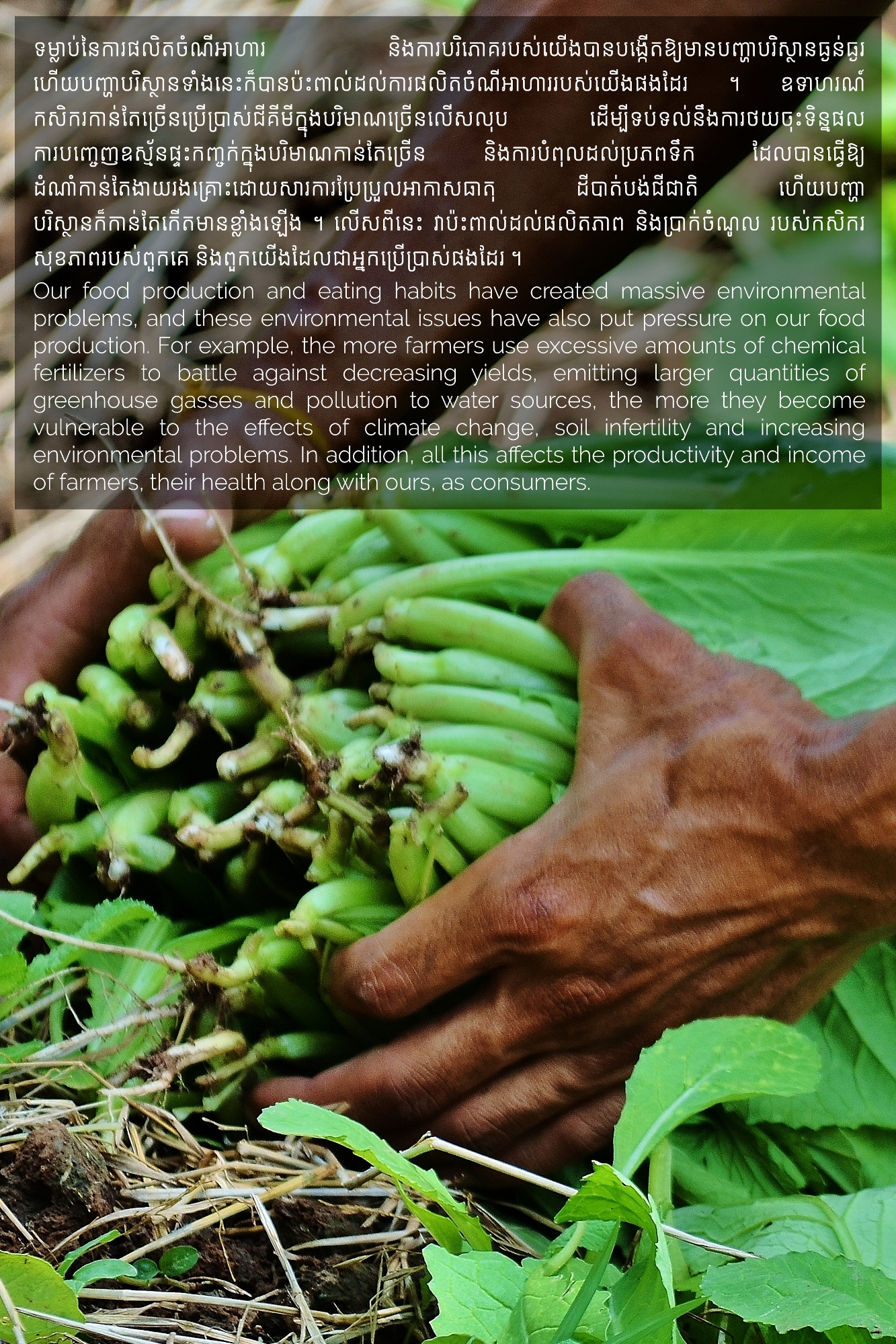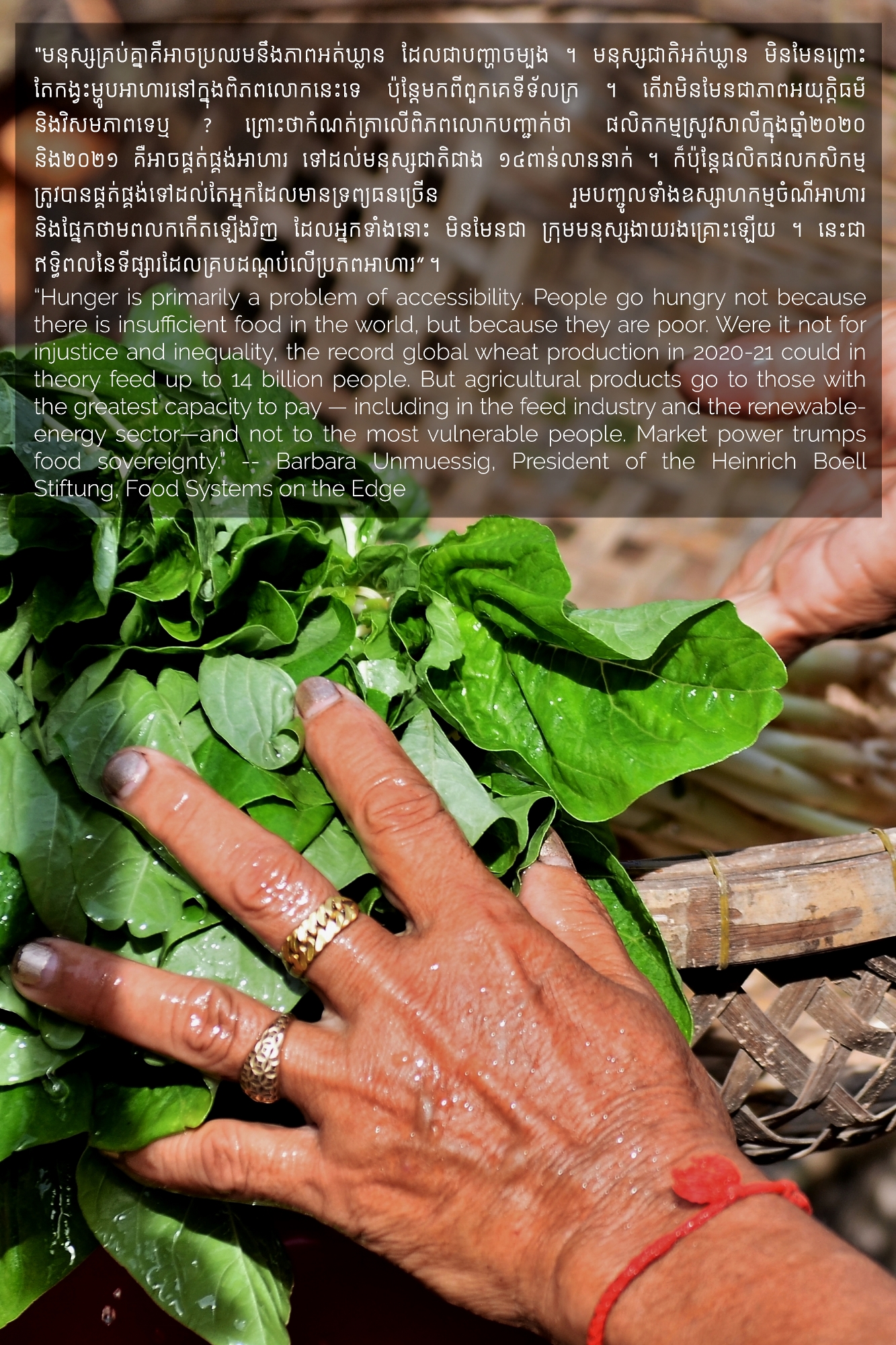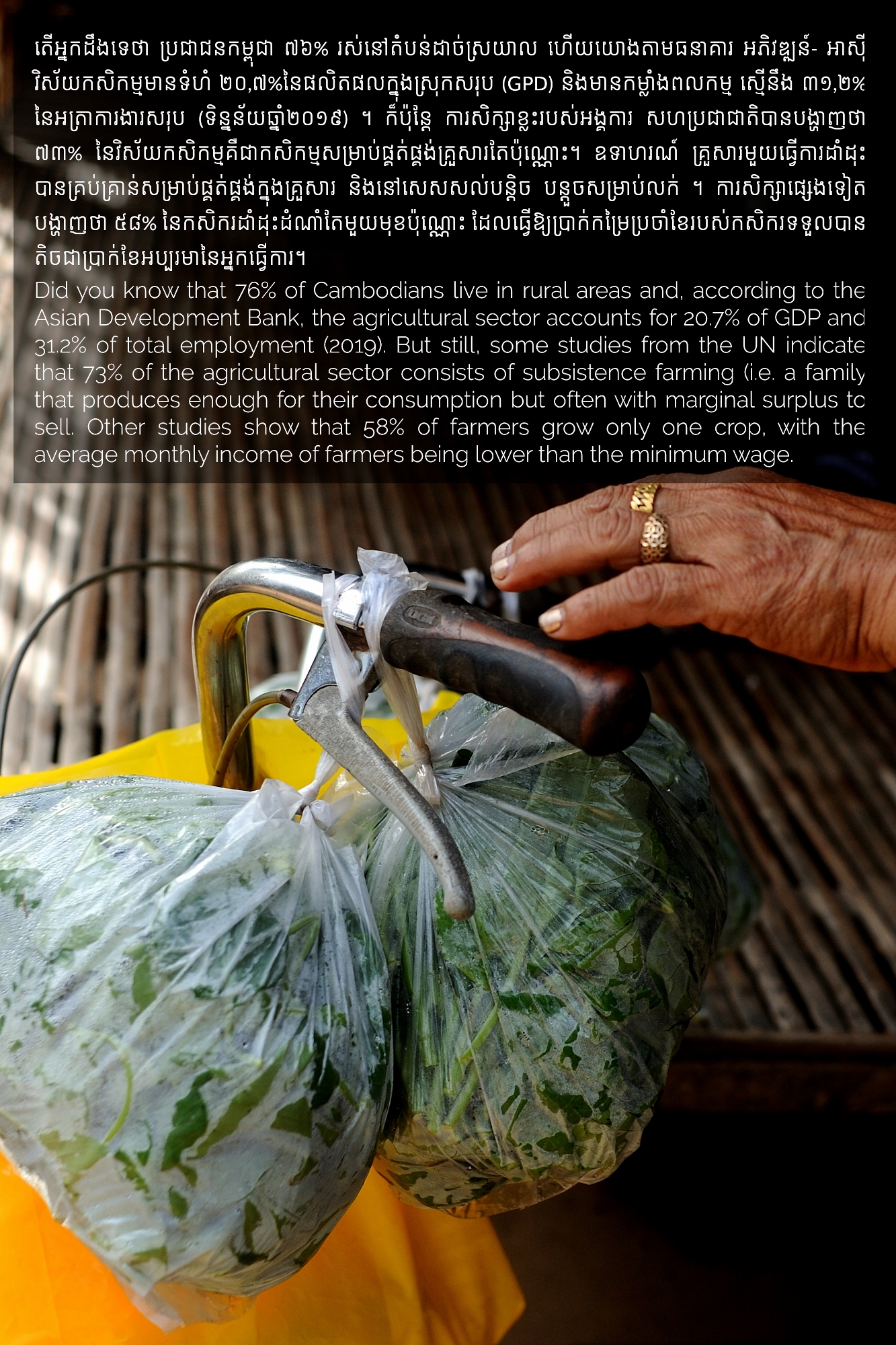 Part of MHOPe, a collaborative media project of Heinrich Böll Stiftung Cambodia on food systems in Cambodia, focusing on topics such as food security and the socio-economic aspects of nutrition, the origins of the ingredients we eat and the invisible lives of the workers along the food cycle. Using a Cambodian traditional dish (Samlor Korko) as a starting point of discussion, we follow each step from pre-production to waste management, addressing the themes of gender and sustainability. We believe we are what we eat and, to give more value to what ends up on our plate, we need to be aware of what’s happening along the way. From farm-to-table and from table-to-farm.